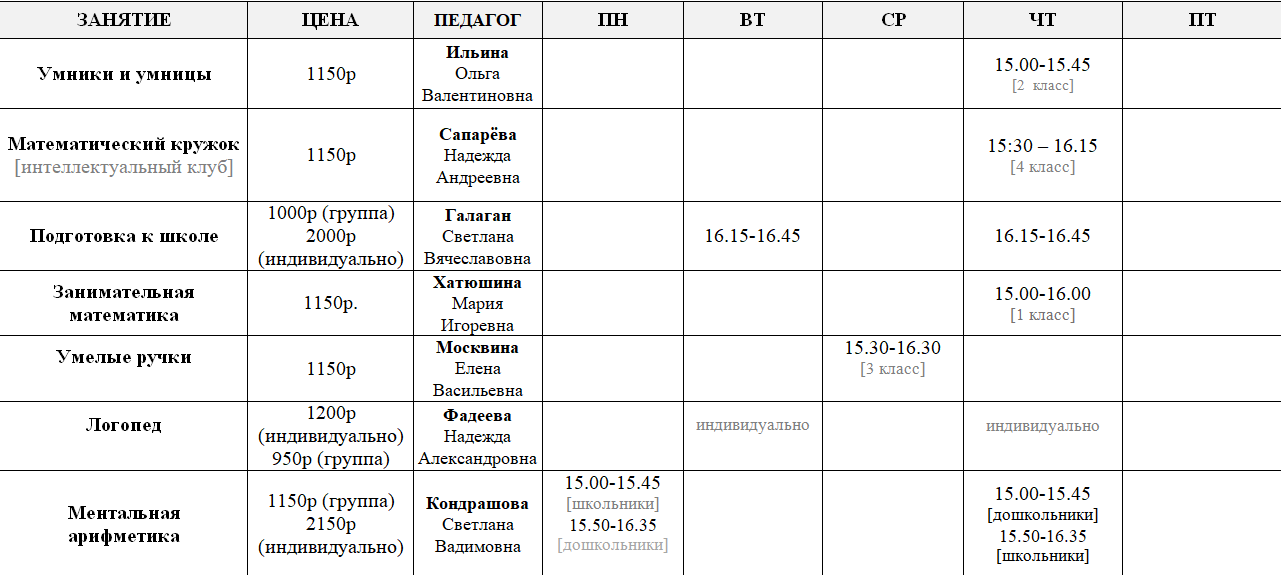 РАСПИСАНИЕ ДОПОЛНИТЕЛЬНЫХ ЗАНЯТИЙ учебный год 02.09.2024- 30.05.2025